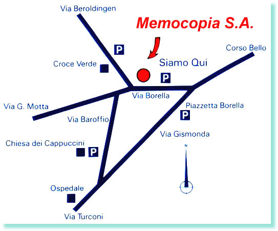 Nella cartina sotto riportata sono facilmente identificabili, dal relativo simbolo, diverse aree adibite a parcheggio nella zona circostante la nostra sede di Via Borella n. 3 a Mendrisio.